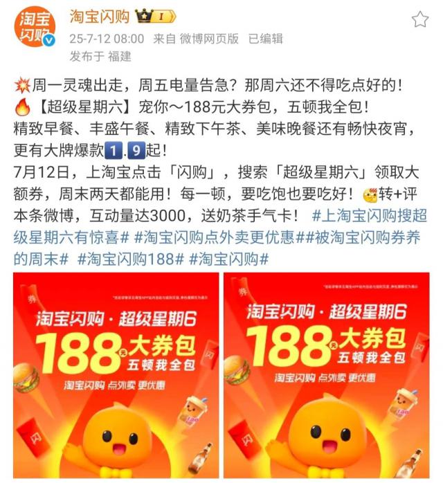 7 月 11 日晚,美團(tuán)官方發(fā)布“周六,快樂繼續(xù)”的微博,預(yù)告本周末的外賣狂歡。7 月 12 日,淘寶閃購官方也在微博宣布“超級(jí)星期六” 188 元大券包,“五頓我全包”。