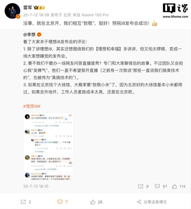 IT之家7月12日消息,今日下午,理想汽車CEO李想發(fā)文談及理想i8的發(fā)布會形式:“要是在北京找個大型場館,大概率得‘致敬小米’了,畢竟北京優(yōu)質(zhì)的大型場館基本都被小米用過。要是去外地舉辦,工作人員的差旅成本太高,還是在北京辦吧。”