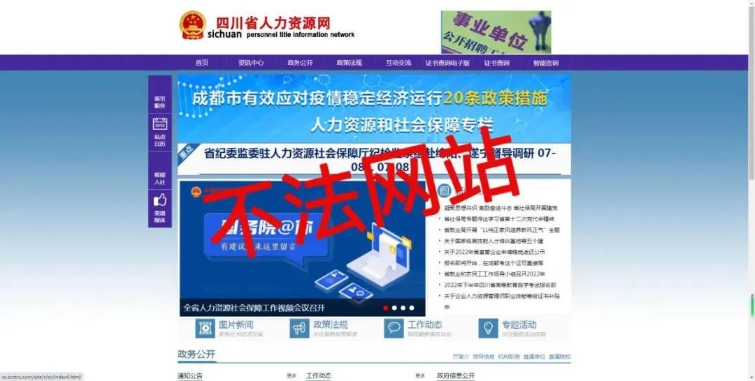 7月11日,四川省人力資源和社會保障廳在其官方網(wǎng)站發(fā)布了關(guān)于非法假冒網(wǎng)站的聲明,內(nèi)容如下: