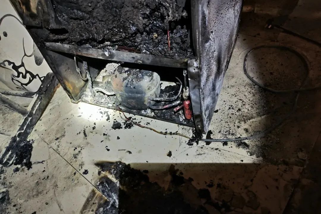 事后,根據(jù)燃燒痕跡認(rèn)定,起火原因為一臺冰箱的內(nèi)部電氣線路故障,冒出火苗后引燃了右側(cè)堆放的可燃物。