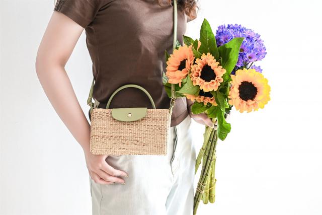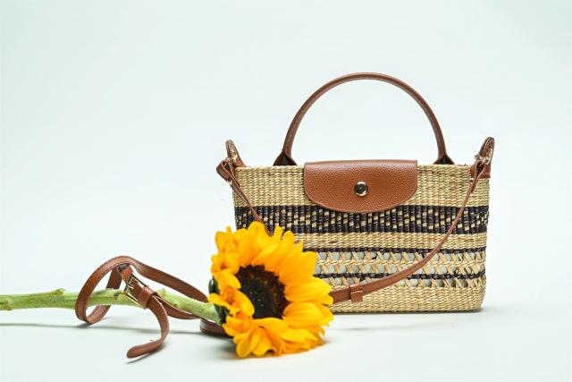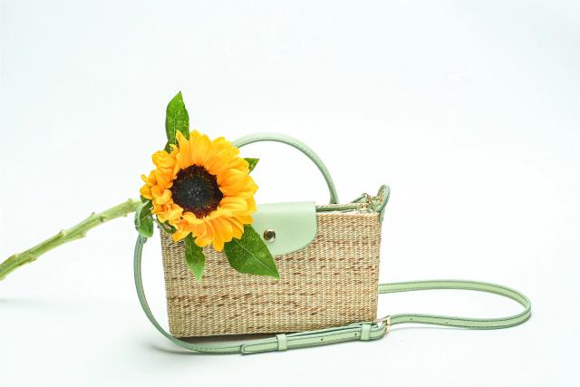 這是一款適合女生出門的斜挎小包,包體采用黃草材質(zhì),簡潔小巧。包上編織有不同的花紋,還配以不同顏色皮質(zhì)的包扣和掛鏈。目前有黑、綠、棕、紫4款顏色,未來會(huì)推出更多新紋樣與顏色,并且可以接受私人定制。