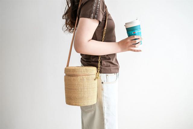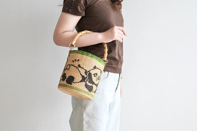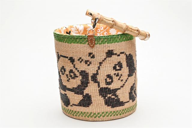 桶包系列多為素色,其中一款周身編有熊貓圖樣的桶包十分亮眼,它以竹節(jié)作為包的手柄,形象生動(dòng)。桶包容量較大,還能自由切換手提、斜背、肩背等背法。