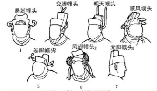 晚唐五代時(shí)期,廣泛出現(xiàn)了翹腳、垂角的硬腳幞頭,這種樣式影響到了宋代。到了宋代,幞頭直接固定成型,不再以包頭巾的方式佩戴,而且有了更多的形狀樣式。比如宋代因二腳有不同交結(jié)法,還區(qū)分出平腳、交腳、曲腳、直腳幞頭之別。像直角、平腳、展腳幞頭為朝廷大臣所服用;曲腳、交角則為仆人、公差等使用;局腳為狀元、翰林所戴(明代多用于歌舞者所戴);卷腳、風(fēng)(鳳)翅腳等幞頭,多用于儀衛(wèi)、歌樂(lè)雜職,順風(fēng)幞頭則常見(jiàn)于平民使用,可見(jiàn)其等級(jí)差別明顯。