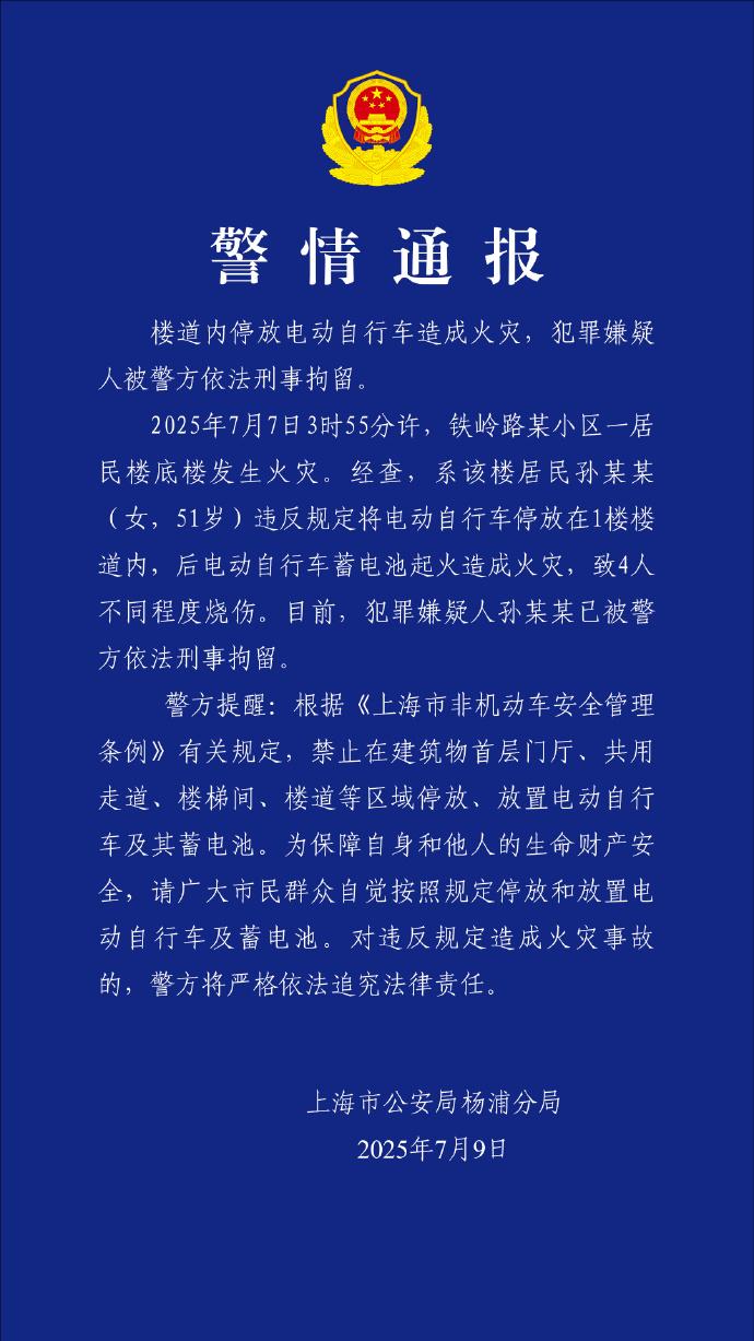 7月9日晚,上海市公安局楊浦分局發(fā)布通報。經(jīng)調(diào)查,該樓居民孫某某(女,51歲)違反規(guī)定將電動自行車停放在1樓樓道內(nèi),隨后電動自行車蓄電池起火引發(fā)火災,導致4人不同程度燒傷。