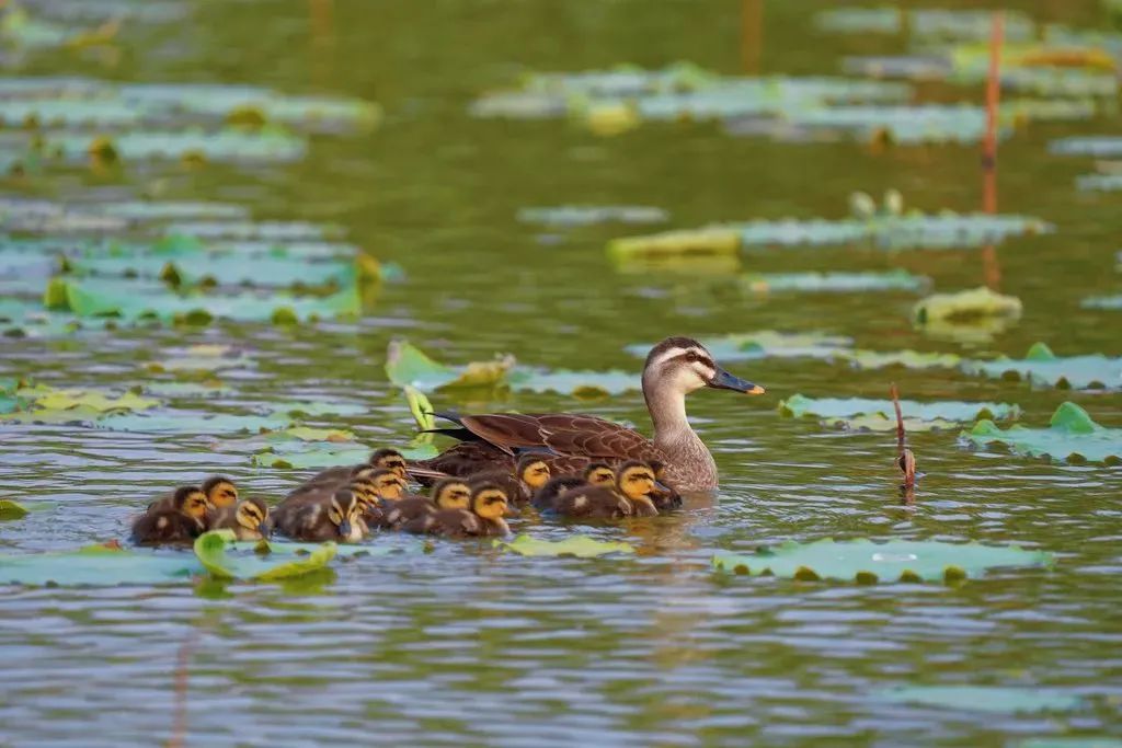 5月21日,在衡水湖,一只斑嘴鴨帶著一群小鴨寶寶在水中游弋嬉戲。(周津攝)