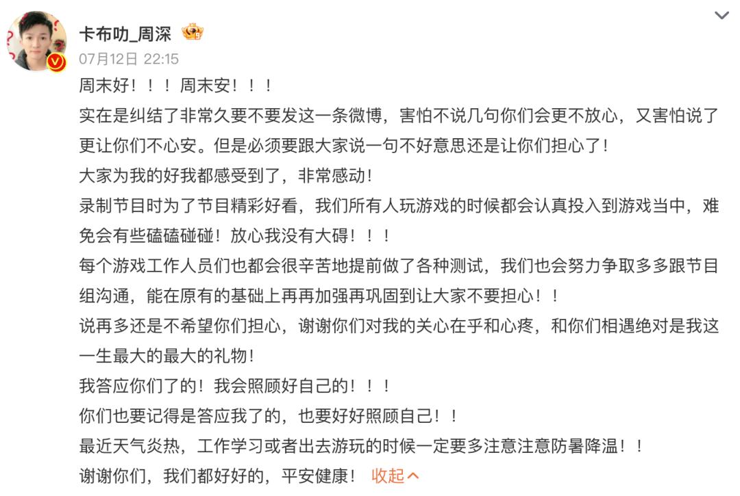 原標(biāo)題:《深夜發(fā)文!歌手周深回應(yīng)錄綜藝遭嘉賓拖拽》