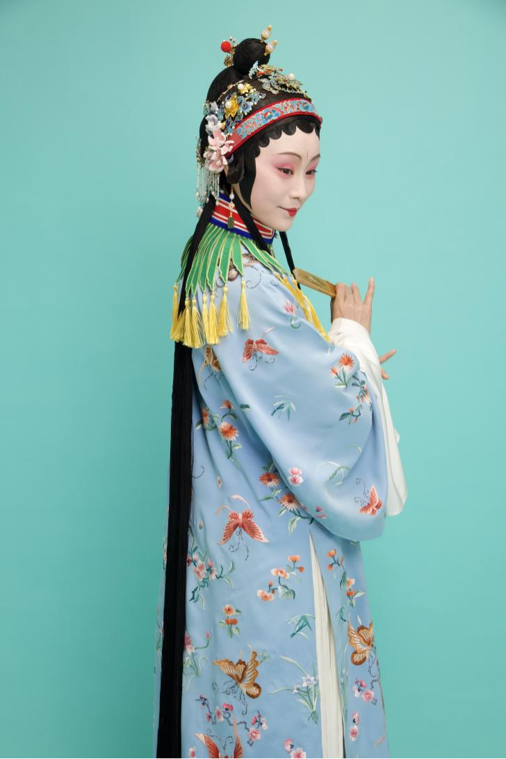人物造型與傳統(tǒng)昆劇裝扮不同。故宮博物院副研究員張銳擔(dān)任服裝設(shè)計,全劇服裝造型嚴(yán)格依照明清宮廷文獻記載,并參考文物的款式顏色進行再創(chuàng)作。杜麗娘的幾套戲服,像“月白衫子”“對兒紅披”“青衣”,都采用蘇州全手繡工藝,纏枝蓮紋用細密針法勾勒,將明清宮廷服飾的莊重華麗與昆曲的浪漫婉約完美融合。