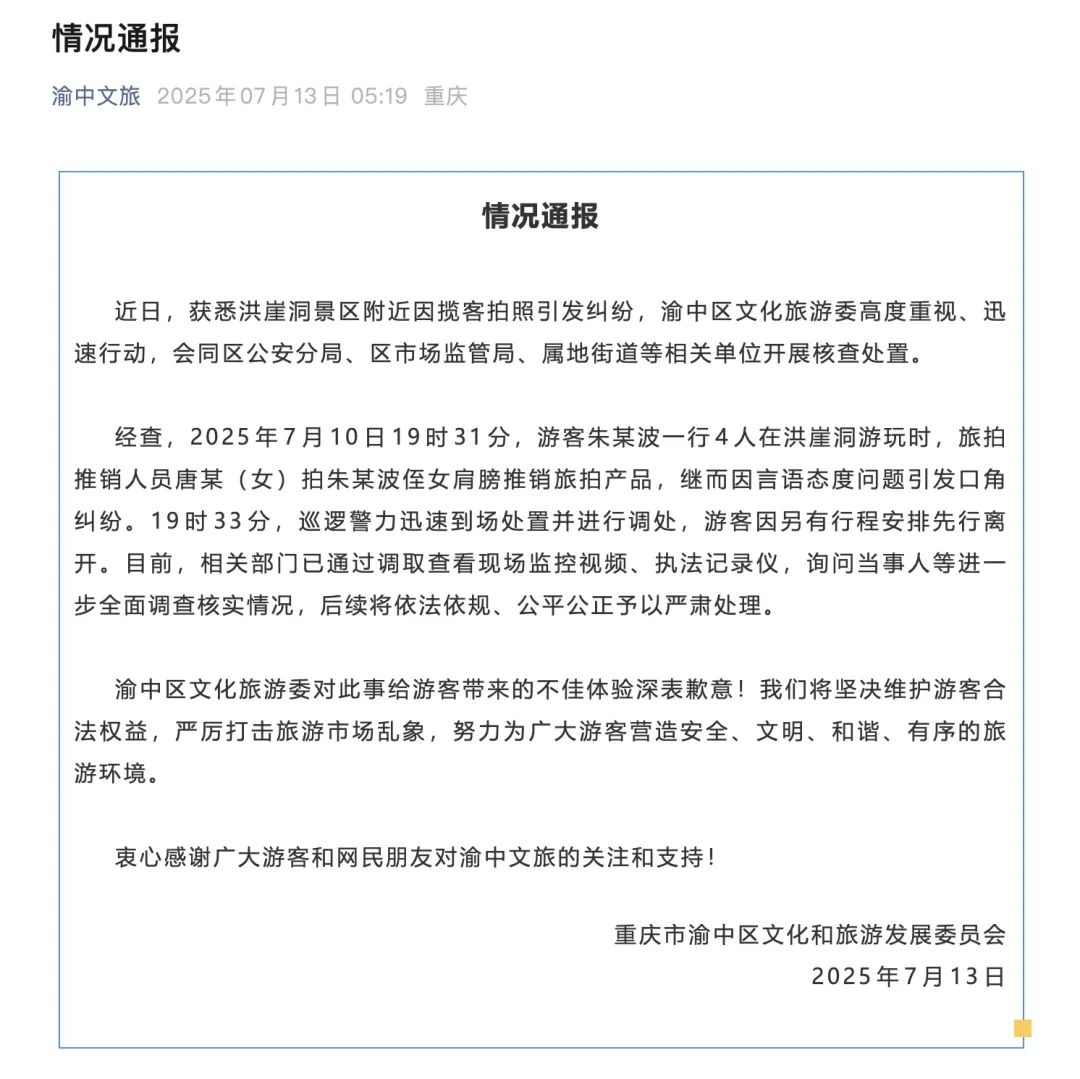 經(jīng)調(diào)查,2025年7月10日19時31分,游客朱某波一行4人在洪崖洞游玩時,旅拍推銷人員唐某(女)拍了朱某波侄女的肩膀來推銷旅拍產(chǎn)品,隨后因言語態(tài)度問題引發(fā)了口角糾紛。19時33分,巡邏警力迅速趕到現(xiàn)場進行處置和調(diào)處,游客因另有行程安排先行離開。目前,相關(guān)部門已通過調(diào)取查看現(xiàn)場監(jiān)控視頻、執(zhí)法記錄儀,詢問當(dāng)事人等方式進一步全面調(diào)查核實情況,后續(xù)會依法依規(guī)、公平公正地嚴肅處理。