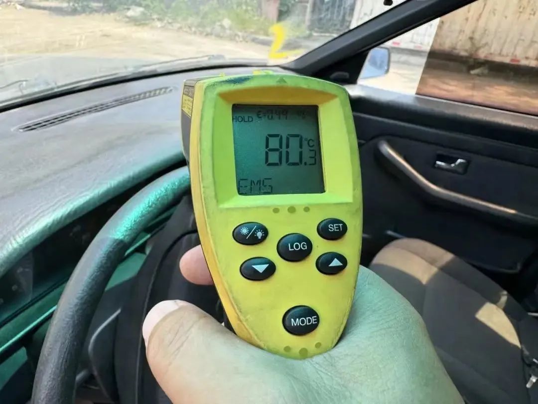 室外溫度40℃時(shí),車內(nèi)氣溫直接爆表,只能用火場(chǎng)用的熱成像儀測(cè)溫,結(jié)果顯示車內(nèi)的溫度已達(dá)60℃,被太陽(yáng)暴曬的儀表臺(tái),溫度更是直沖90℃。