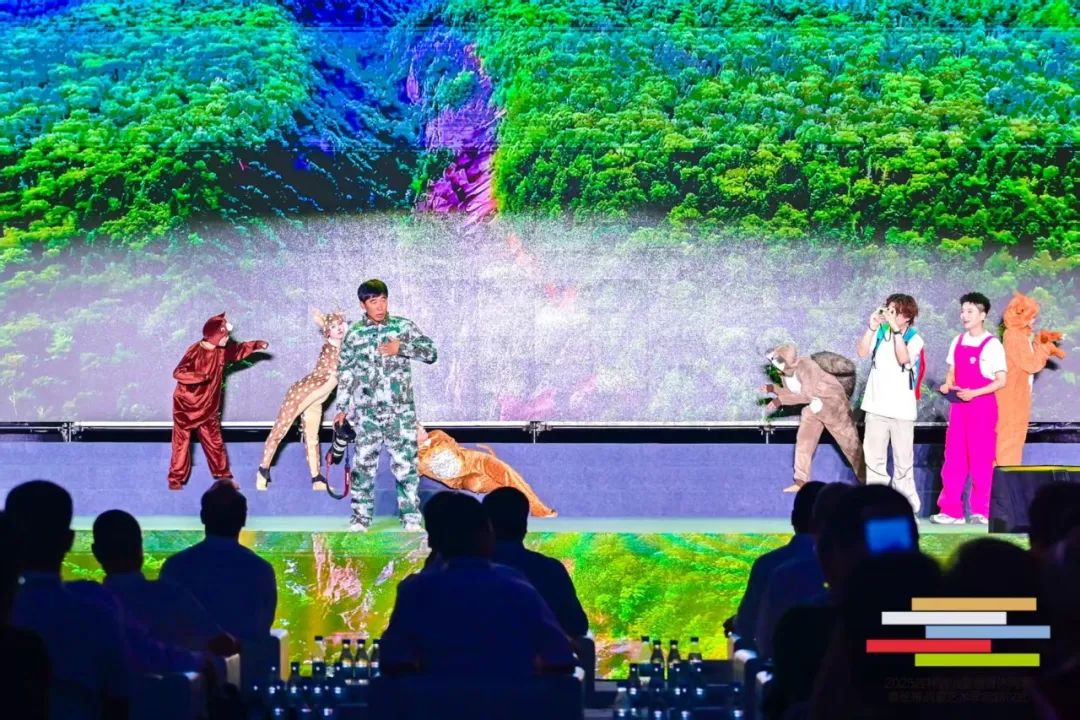 真實的梅花鹿與舞蹈演員的表演相得益彰,上班族與AI導游的互動趣味十足,演員們載歌載舞演繹的吉林漫游場景充滿活力,再配合多維度屏幕構建的立體視效,讓整臺舞臺劇極具感染力。