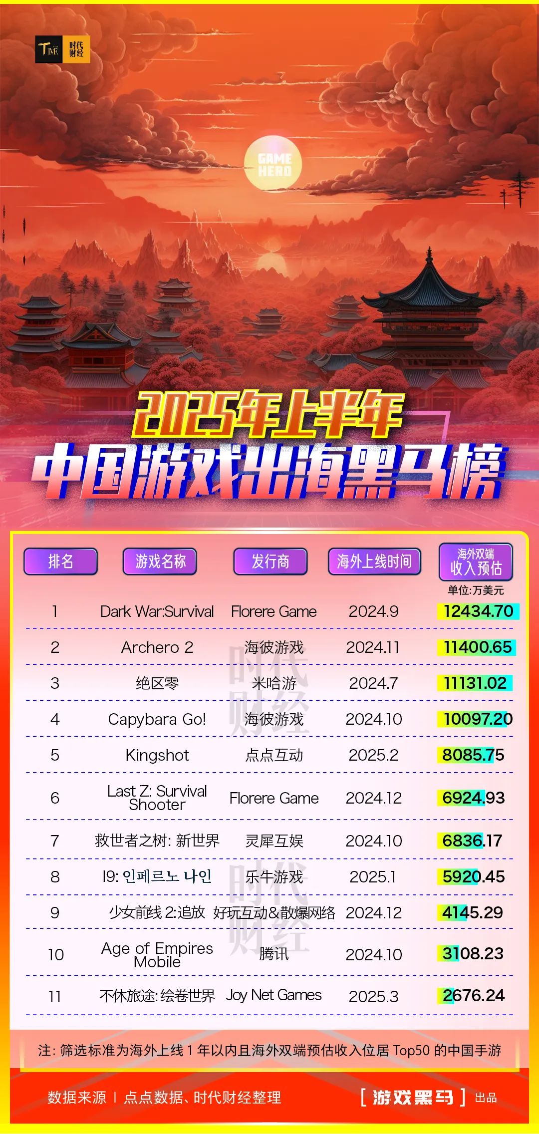 時(shí)代財(cái)經(jīng)以上線1年以內(nèi)且海外雙端預(yù)估收入躋身Top50的中國手游為標(biāo)準(zhǔn),統(tǒng)計(jì)并發(fā)布了《2025年上半年中國游戲出海黑馬榜》(下稱“《出海黑馬榜》”)。