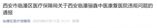 7月11日,西安市臨潼區(qū)醫(yī)療保障局發(fā)布了關(guān)于西安臨潼驪鑫中醫(yī)康復(fù)醫(yī)院違規(guī)問題的通報。