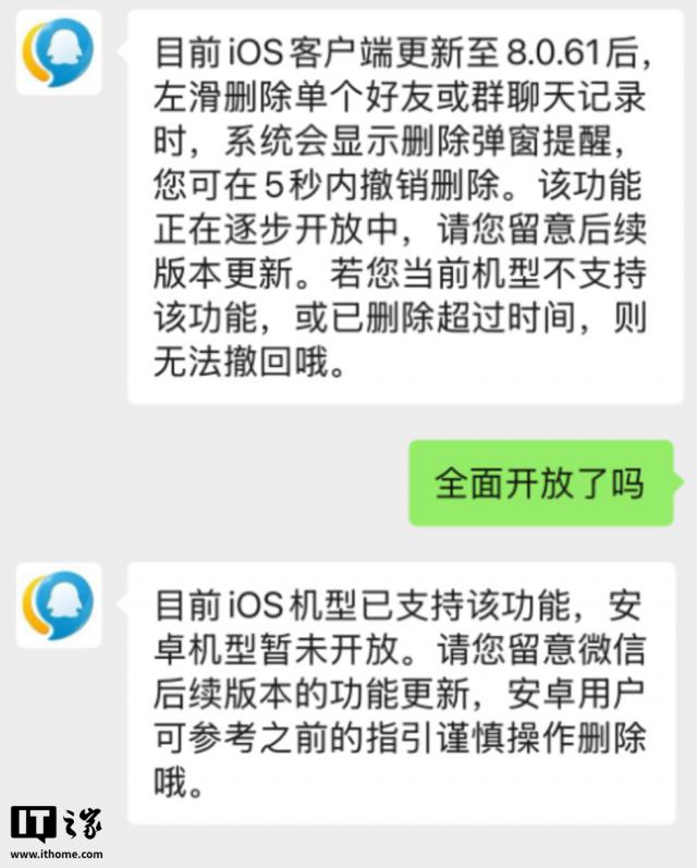 騰訊客服表示,這一功能是微信為防止用戶誤操作而推出的。當用戶左滑刪除單個好友或群聊天記錄時,系統(tǒng)會彈出刪除提醒彈窗,用戶在5秒內(nèi)可撤銷刪除操作。不過,該功能目前尚未全面開放,僅iOS設備中已更新至8.0.61及以上版本的部分機型支持,其他設備暫未開放此功能。