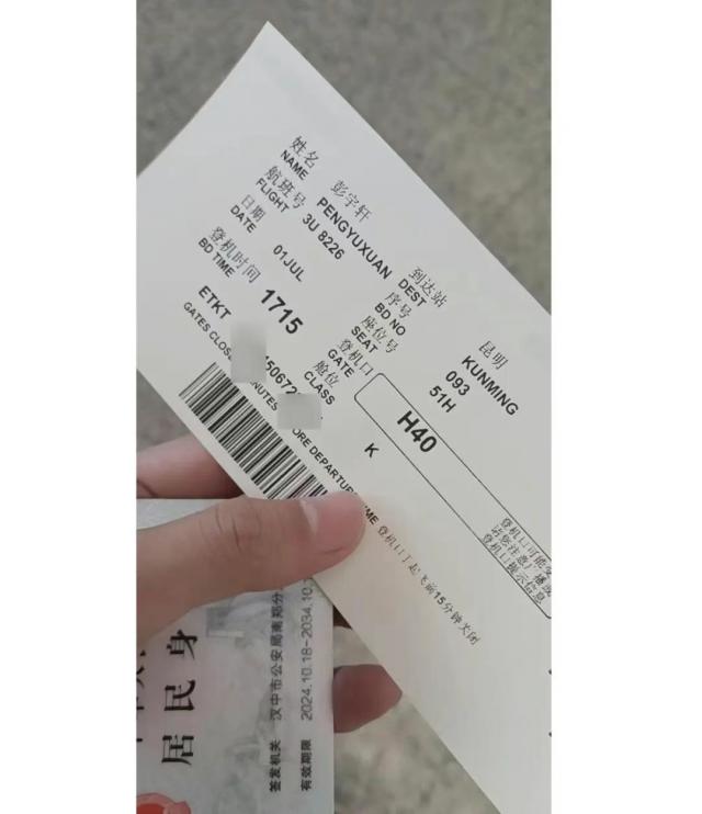 7月1日,彭宇軒給小佳發(fā)來(lái)當(dāng)天下午5時(shí)15分前往昆明的航班登機(jī)牌,當(dāng)晚8時(shí)許抵達(dá)昆明長(zhǎng)水機(jī)場(chǎng),還開(kāi)心地稱(chēng)有人給了他500元住酒店。