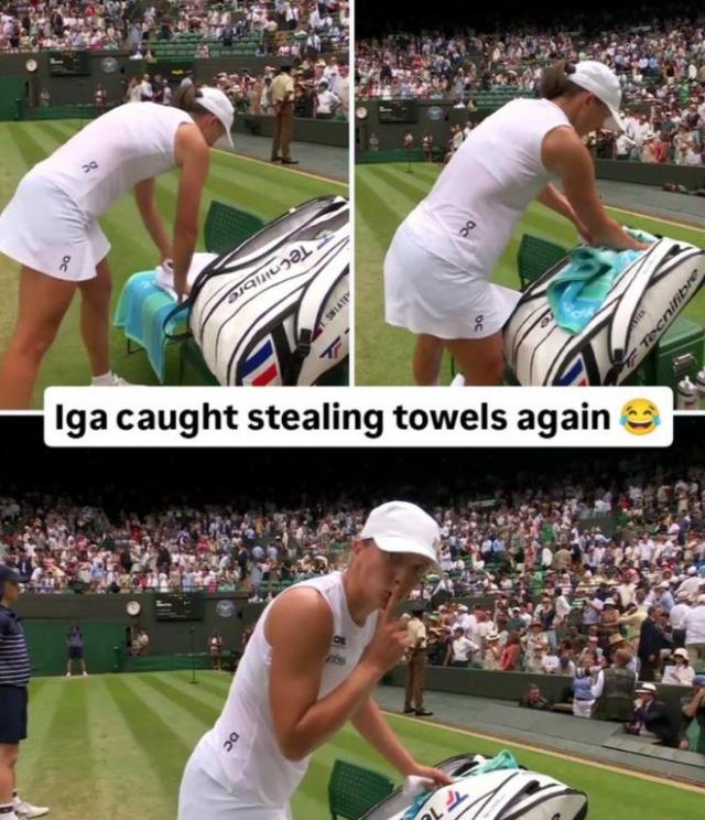 大家都知道,斯瓦泰克特別喜歡在比賽后收集毛巾,因為賽后有很多親戚朋友會向她索要毛巾。通常每場比賽球員能獲得6條毛巾,但斯瓦泰克覺得這遠遠不夠。之前,她被拍到賽后瘋狂往自己包里塞毛巾的畫面,因此被球迷戲稱為“毛巾大盜”。
