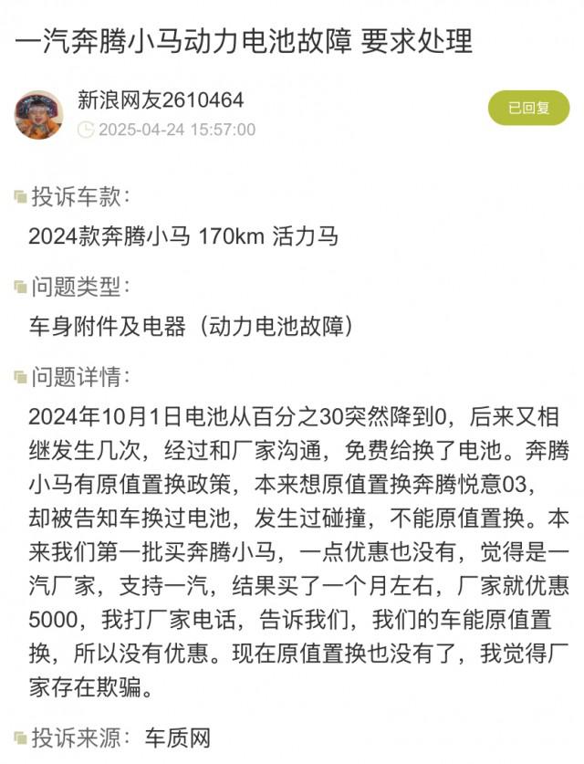 2024年11月,有車(chē)主購(gòu)買(mǎi)的奔騰小馬使用一個(gè)月后出現(xiàn)動(dòng)力電池故障,車(chē)輛突然沒(méi)電,影響日常使用。此外,還有車(chē)主反映,奔騰小馬行駛中電池電量突然下降,甚至車(chē)輛無(wú)法啟動(dòng),嚴(yán)重影響行車(chē)安全。