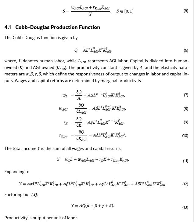 研究使用多種生產(chǎn)函數(shù),構(gòu)建“Power shift”模型,模擬AGI代替人力的影響。用量化數(shù)據(jù)揭示AGI替代效應(yīng)與勞動(dòng)收益崩潰的臨界閾值,和“年?duì)I收1000億美元即是AGI”的判斷方式類似:無(wú)法理論定義,就設(shè)個(gè)數(shù)字,數(shù)字相對(duì)“客觀”。