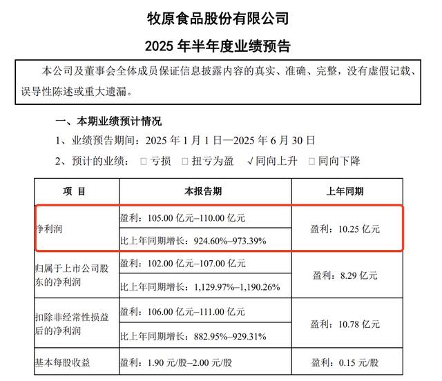 7月9日盤后,牧原股份披露的半年度業(yè)績預(yù)告,預(yù)告顯示,今年上半年牧原股份預(yù)計實現(xiàn)凈利潤為105億元至110億元,比上年同期的10.25億元增長924.60%至973.39%;預(yù)計實現(xiàn)歸母凈利潤102億元至107億元,同比增長1129.97%至1190.26%。