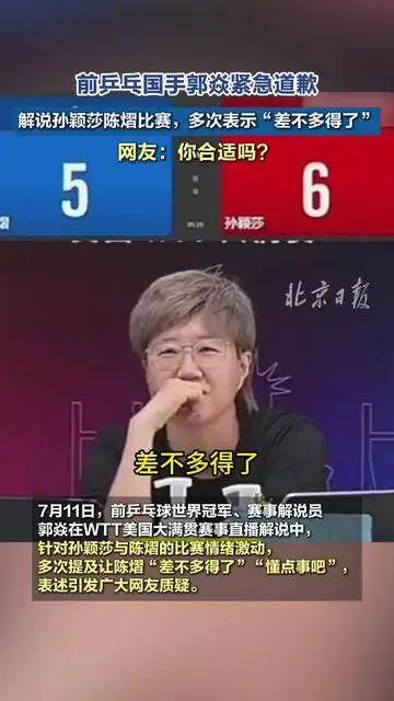 據(jù)東方體育日報消息,7月11日,前乒乓球世界冠軍、賽事解說員郭焱在WTT美國大滿貫賽事直播解說中,針對孫穎莎與陳熠的比賽,情緒激動地多次提及讓陳熠“差不多得了”“懂點事吧”等表述,引發(fā)廣大網(wǎng)友質(zhì)疑。