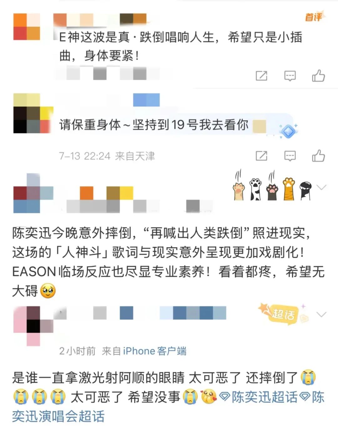 現(xiàn)場(chǎng)不少歌迷表示,陳奕迅摔倒時(shí)發(fā)出很大聲響。盡管他迅速爬起,繼續(xù)照常演唱,但大家還是十分擔(dān)心他的狀況。還有歌迷反映,此次演唱會(huì)舞臺(tái)上臺(tái)階眾多,表演者稍不留意就可能摔倒。