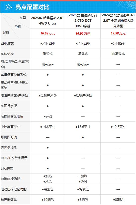 配置方面,哈弗猛龍燃油版與捷途旅行者整體表現(xiàn)相近,在安全性和越野功能上都保持著較高水準。不過,哈弗猛龍燃油版在舒適性和便捷性配置上更為豐富,能為長途穿越等場景提供更愜意的駕乘體驗。捷途旅行者則在智能化方面略占優(yōu)勢,而北京越野全新BJ40盡管擁有更為專業(yè)的非承載式車體結(jié)構(gòu)和分時四驅(qū)形式,但配置水平相對較低。