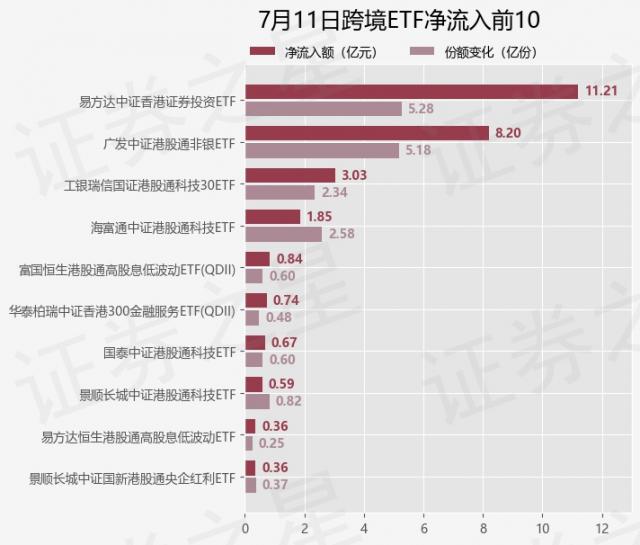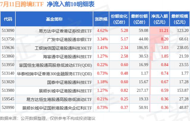當(dāng)日有42只跨境ETF基金資金呈現(xiàn)凈流入狀態(tài)。其中,易方達(dá)中證香港證券投資ETF(513090)凈流入額居首,其份額增加了5.28億份,凈流入金額達(dá)11.21億元。