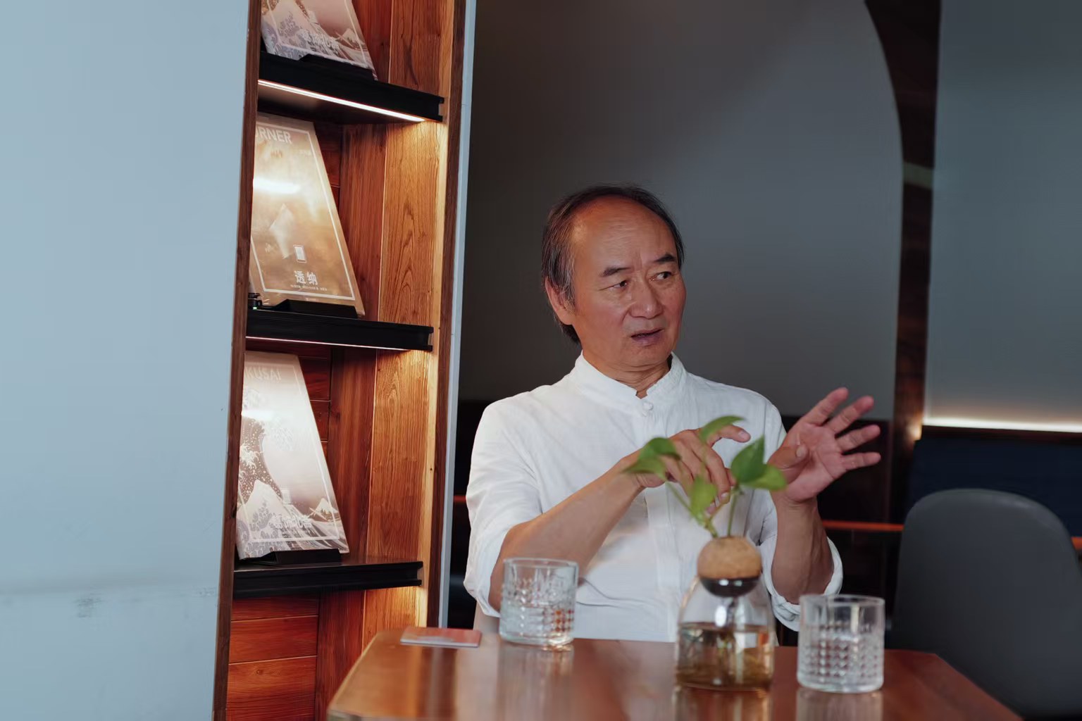 劉亮程在上海朵云書院戲劇店接受澎湃新聞·文學花邊獨家專訪。攝影:周澤洋