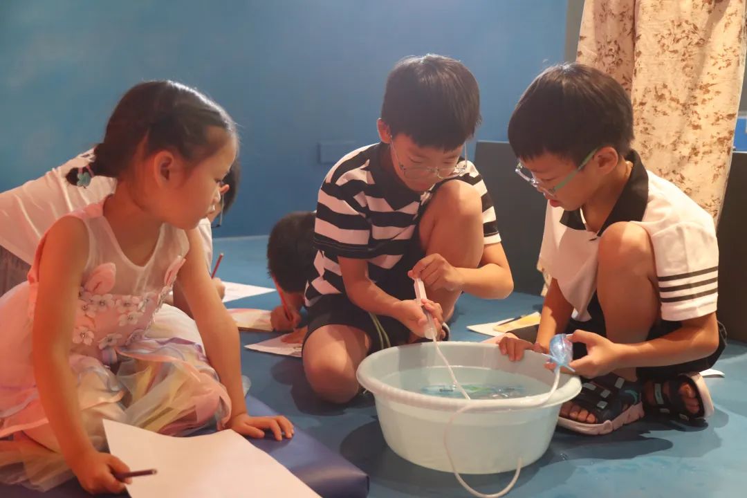 聽完故事后,實(shí)驗(yàn)環(huán)節(jié)將現(xiàn)場(chǎng)氣氛推向了高潮。在老師的引導(dǎo)下,孩子們興奮地分組合作。他們先把注射器連接到潛水艇的排氣管,再把潛水艇放入水盆灌滿水,接著給氣球充氣把水排出,最后抽出空氣進(jìn)行觀察……通過這個(gè)有趣的浮力小實(shí)驗(yàn),書本上抽象的原理,一下子變成了孩子們手中看得見、摸得著的“玩具”。