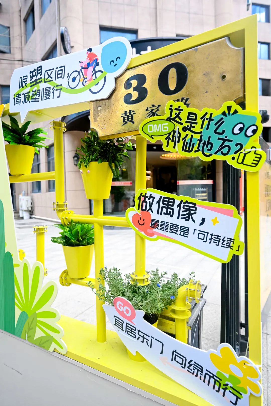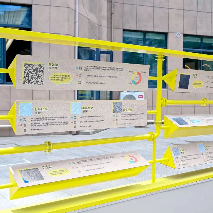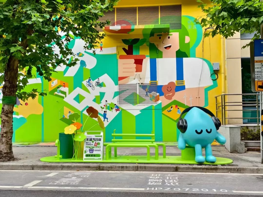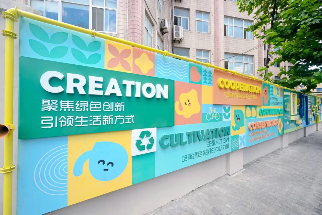 街區(qū)氛圍版面的展示,采用再生可降解塑料板材為基底,聯(lián)合藝術(shù)家團隊創(chuàng)作立體浮雕工藝花卉,配合高飽和度色彩搭配與光影折射,讓IP角色生活故事、低碳知識“活起來”,讓宣傳版面成為綠色生活與低碳理念的全新載體。