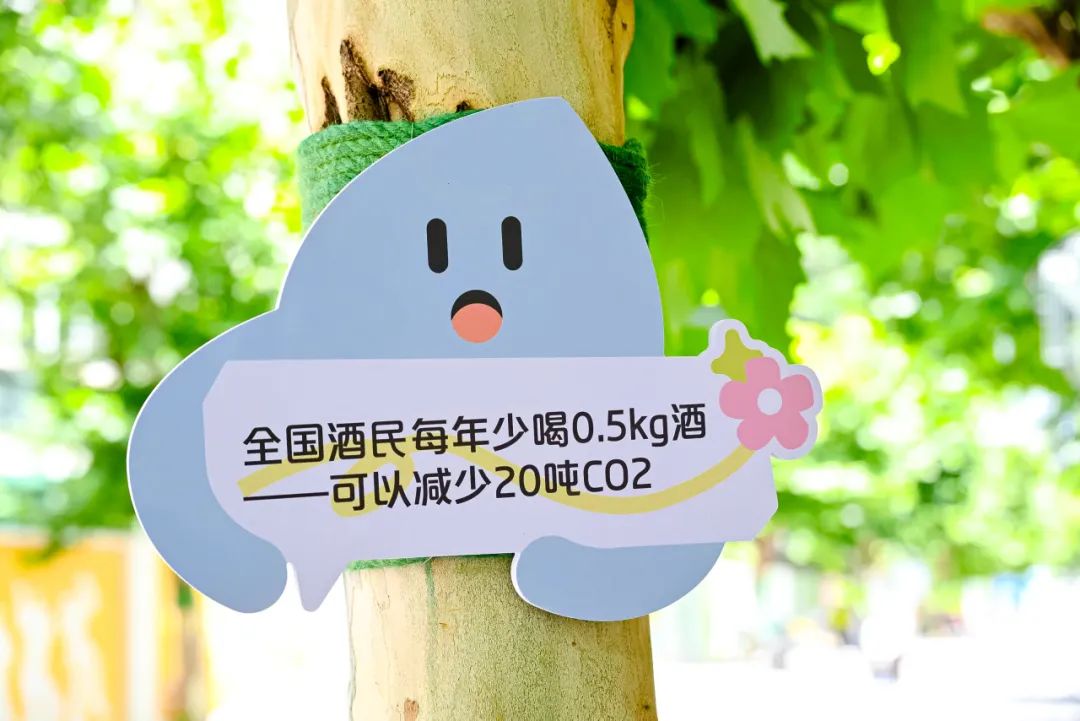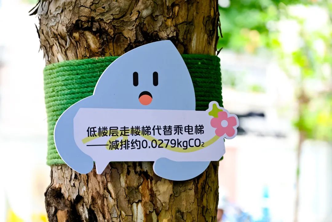 沿著黃家路,間隔選取部分合適樹木,采用麻繩固定的方式(可替換),用雙語標語呈現(xiàn)減碳及碳足跡可視化數(shù)據(jù),體現(xiàn)別樣“海派”生活。