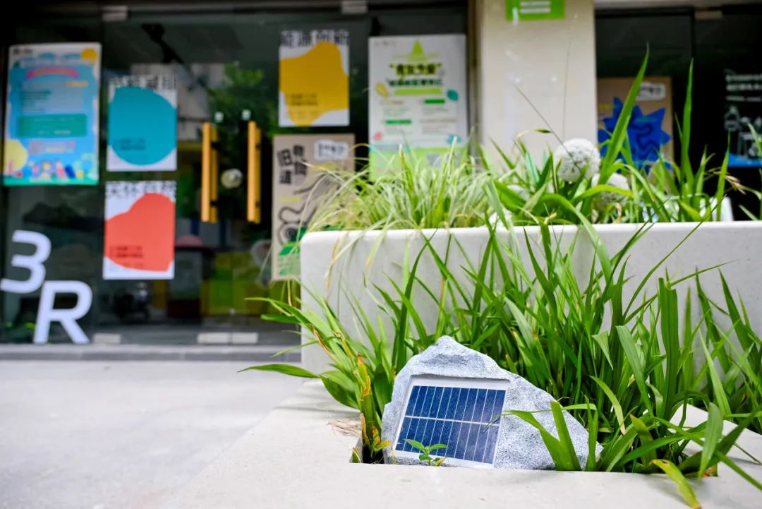 在街角綠蔭下,創(chuàng)新設(shè)置了若干光伏供能仿石生態(tài)音響,舒緩輕松的白噪音,是治愈系的聽覺驛站,讓人群的腳步慢下來,享受街區(qū),聆聽自然。