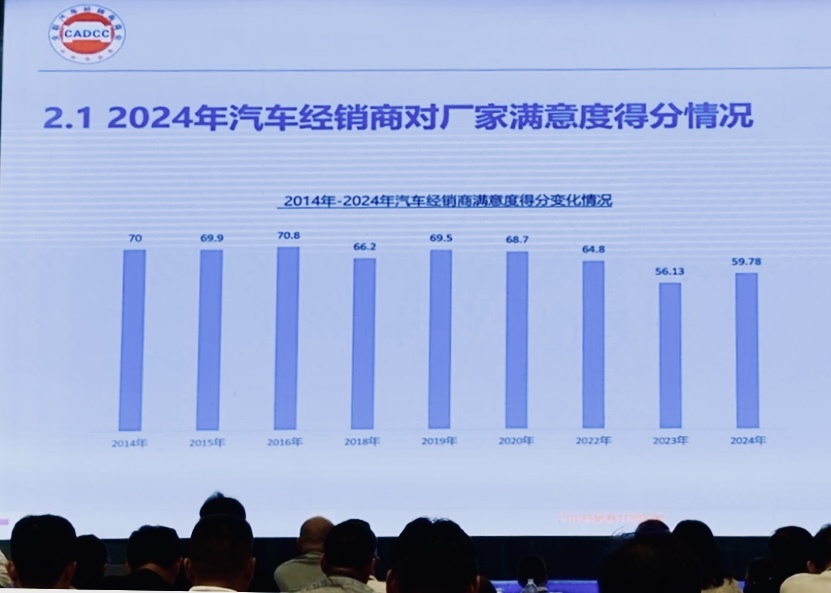 全國(guó)工商聯(lián)汽車經(jīng)銷商商會(huì)秘書長(zhǎng)邢海濤介紹,剛發(fā)布的《汽車經(jīng)銷商對(duì)生產(chǎn)廠家滿意度調(diào)研暨汽車經(jīng)銷商生存狀況調(diào)研報(bào)告》顯示,圍繞“品牌與產(chǎn)品、網(wǎng)絡(luò)建設(shè)、商務(wù)政策、投資回報(bào)”等核心指標(biāo),2024年汽車經(jīng)銷商對(duì)主機(jī)廠的整體滿意度得分為59.78分,同比略有上升,但整體仍處于低位。此前,這一滿意度得分曾多次達(dá)到或接近70分。