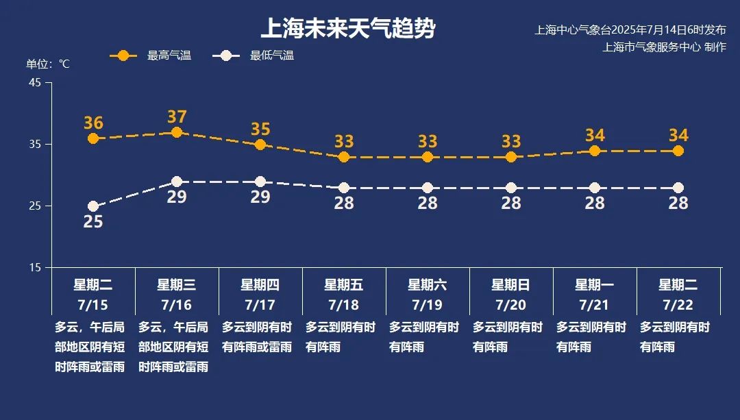 7月15日(周二):天氣為多云,午后部分地區(qū)陰天并有短時陣雨或雷雨,氣溫25℃ - 36℃