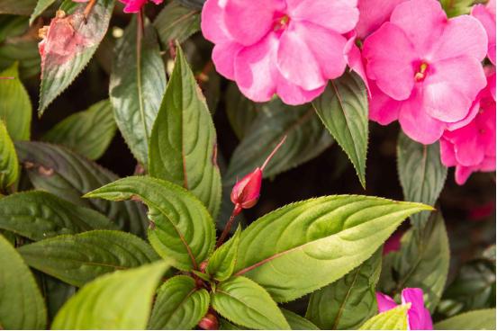 其實(shí)可以通過葉片區(qū)分,蘇丹鳳仙花的葉片短,葉型較圓;新幾內(nèi)亞鳳仙花葉片長,葉形尖銳,葉色較深,有時會顯黑色,并出現(xiàn)深色的葉中脈。