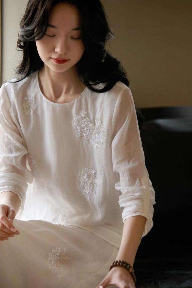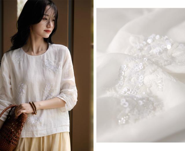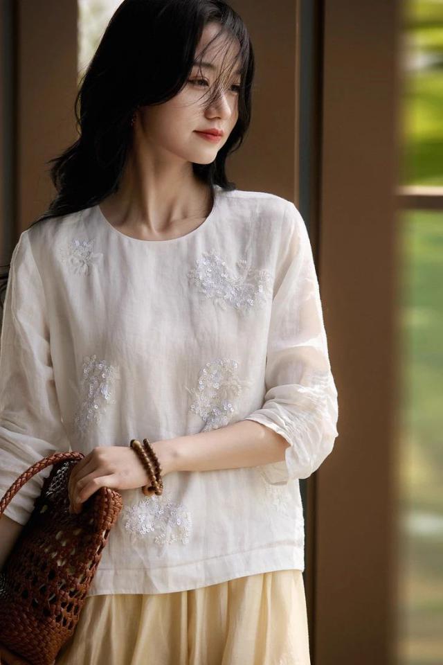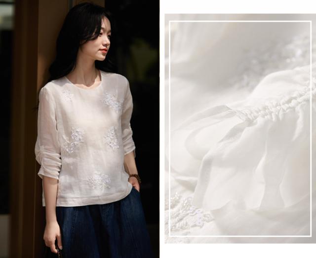 款式一:繁花珠片繡花棉麻七分袖上衣