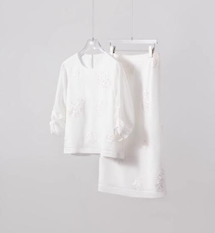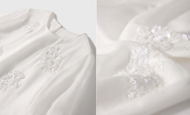 這套小白裙視覺上清雅,但絕不簡單。繁花似錦的刺繡點綴著整件衫裙,讓衣服仿佛有了生命,如同繁花入夢。這是高定奢牌才舍得用的重工亮片刺繡,沒有濃墨重彩,只用淡淡的白色絲線和不同層次的珠光白亮片,繡出的朵朵繁花立體感十足,就像自然生長出來的花朵。