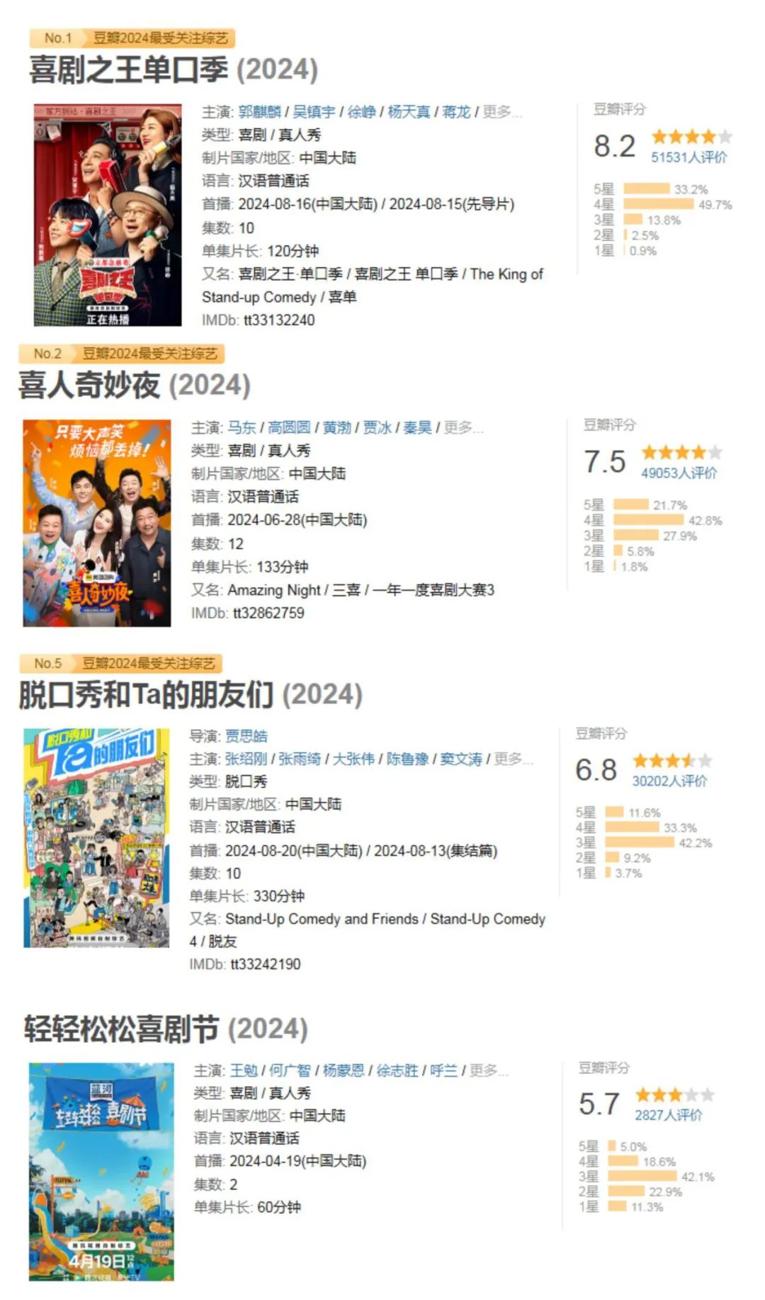 藝恩數(shù)據(jù)顯示,2024年喜劇綜藝播映指數(shù)同比增長51.3%,《喜單》《脫友》和《喜人奇妙夜》的播映指數(shù)、貓眼熱度和云合播放均位居前三,在微博上也形成了強(qiáng)大的輿論聲量,官微話題閱讀量均超10億。