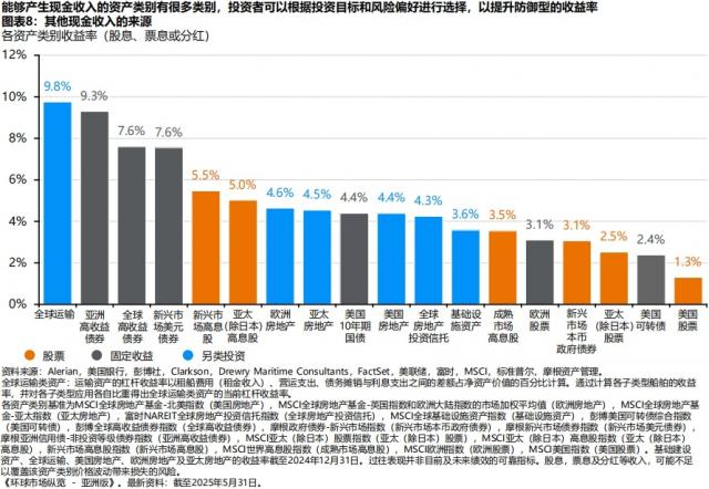 另類投資方面,不確定性環(huán)境中短中期市場波動(dòng)性可能大增,投資者可考慮傳統(tǒng)股債資產(chǎn)以外的現(xiàn)金收入來源,增強(qiáng)組合韌性。比如基礎(chǔ)設(shè)施、房地產(chǎn)及交通運(yùn)輸?shù)攘眍愘Y產(chǎn),長期回報(bào)與股債資產(chǎn)相關(guān)性低,能帶來可預(yù)測的現(xiàn)金收入,降低資產(chǎn)組合波動(dòng)性。