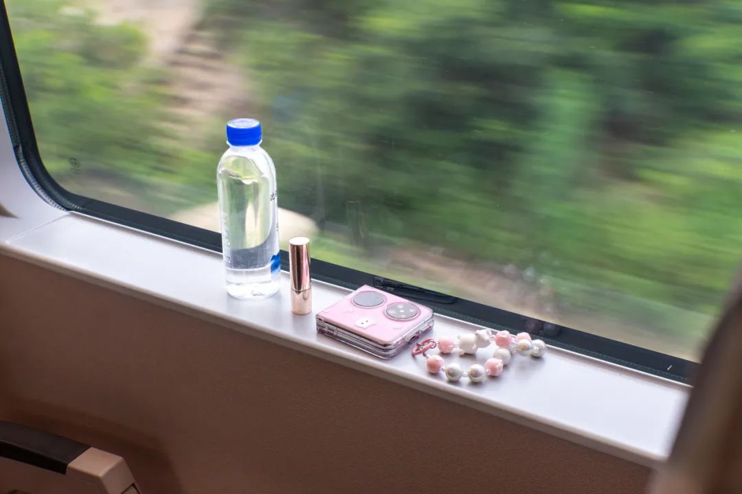 F座窗臺放置水杯、手機等物品,絲毫不晃動,因為高鐵運行非常穩(wěn)。