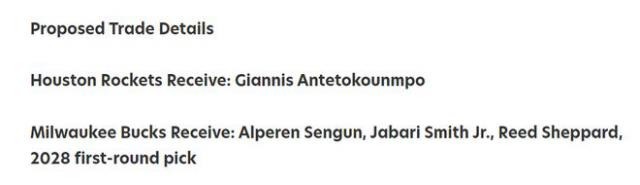 美媒模擬出了一筆交易方案,火箭將送出阿爾佩倫 - 申京、小賈巴里 - 史密斯、里德 - 謝潑德以及2028年火箭首輪簽,從而得到字母哥,這是一筆4換1的交易。