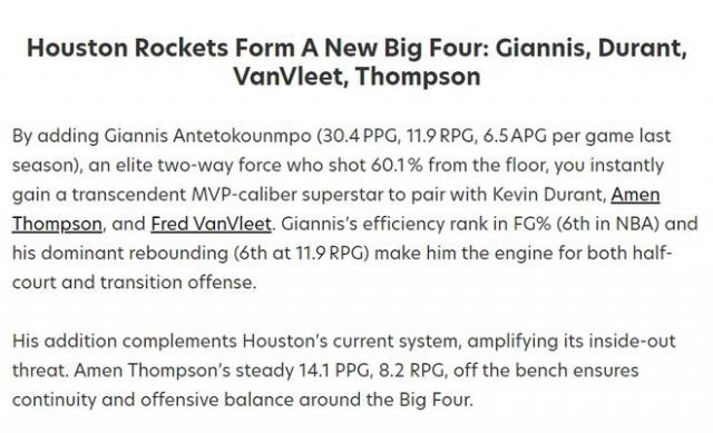 對(duì)于這支火箭隊(duì)而言,若想與衛(wèi)冕冠軍俄克拉荷馬雷霆隊(duì)競(jìng)爭(zhēng),交易得到超級(jí)巨星揚(yáng)尼斯是最快捷的途徑,同時(shí)阿門(mén)也能更專(zhuān)注于防守端。
