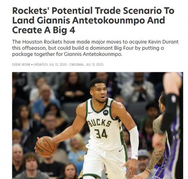 美媒提議火箭再追字母哥:4換1方案送申京,組字母+KD沖擊總冠軍