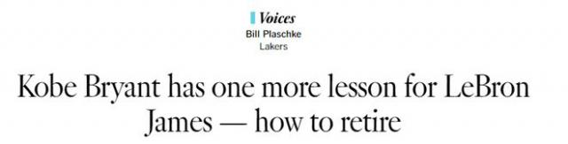 北京時(shí)間7月14日,湖人專家Bill Plaschke發(fā)表專欄文章,標(biāo)題是《科比還能給詹姆斯上一課,那就是如何退役》,以下是Plaschke的觀點(diǎn)——