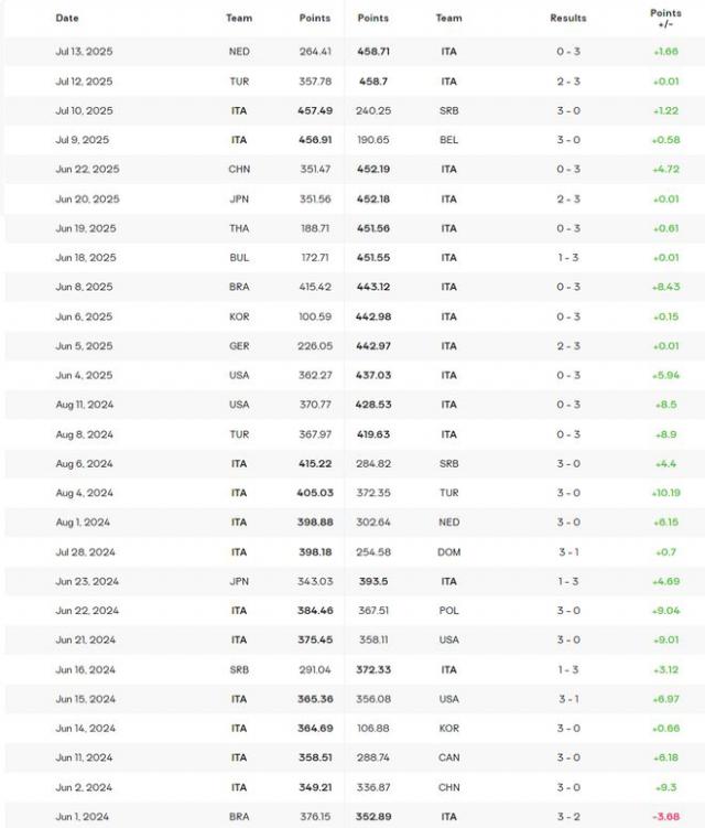從世界排名積分來看,意大利女排上一次在國際大賽中輸球要追溯到2024年6月1日,當時她們以2 - 3不敵巴西。從2024年6月2日至2025年7月13日,意大利女排足足406天未嘗一敗,期間取得26連勝,其作為世界第一的硬實力可見一斑。