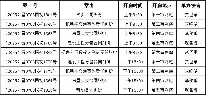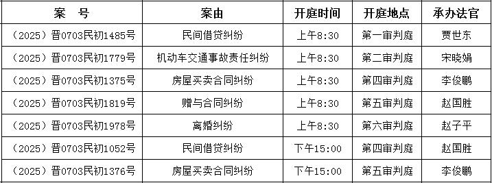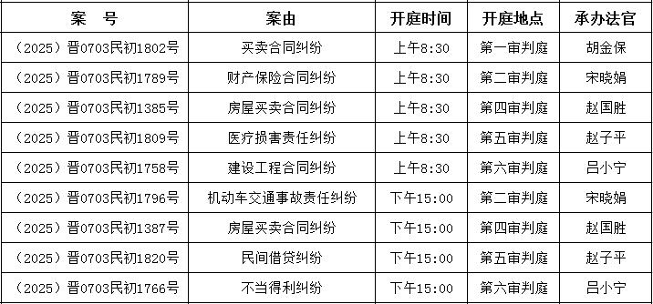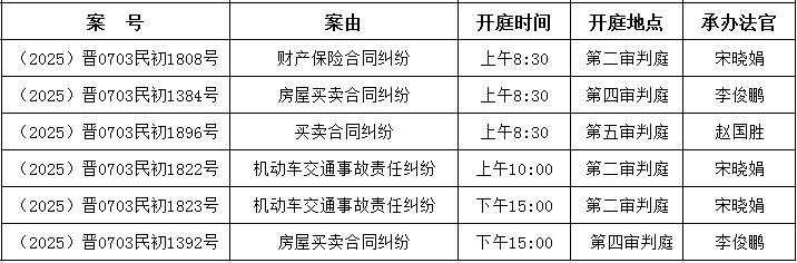 小編整理了2025年7月14日至7月18日開庭審理的案件。若有您的案件,請(qǐng)準(zhǔn)時(shí)參加開庭;即便沒有您的案件,感興趣的朋友也可攜帶身份證前來(lái)旁聽。除法律規(guī)定涉及國(guó)家秘密、商業(yè)秘密、個(gè)人隱私以及當(dāng)事人申請(qǐng)不公開的案件外,均為公開審理。以下開庭信息是提前整理的,由于案件審理中可能出現(xiàn)調(diào)解、撤訴、延期審理等特殊情況,開庭時(shí)間可能會(huì)排期調(diào)整,若與實(shí)際開庭時(shí)間、地點(diǎn)不符,以實(shí)際情況為準(zhǔn)。