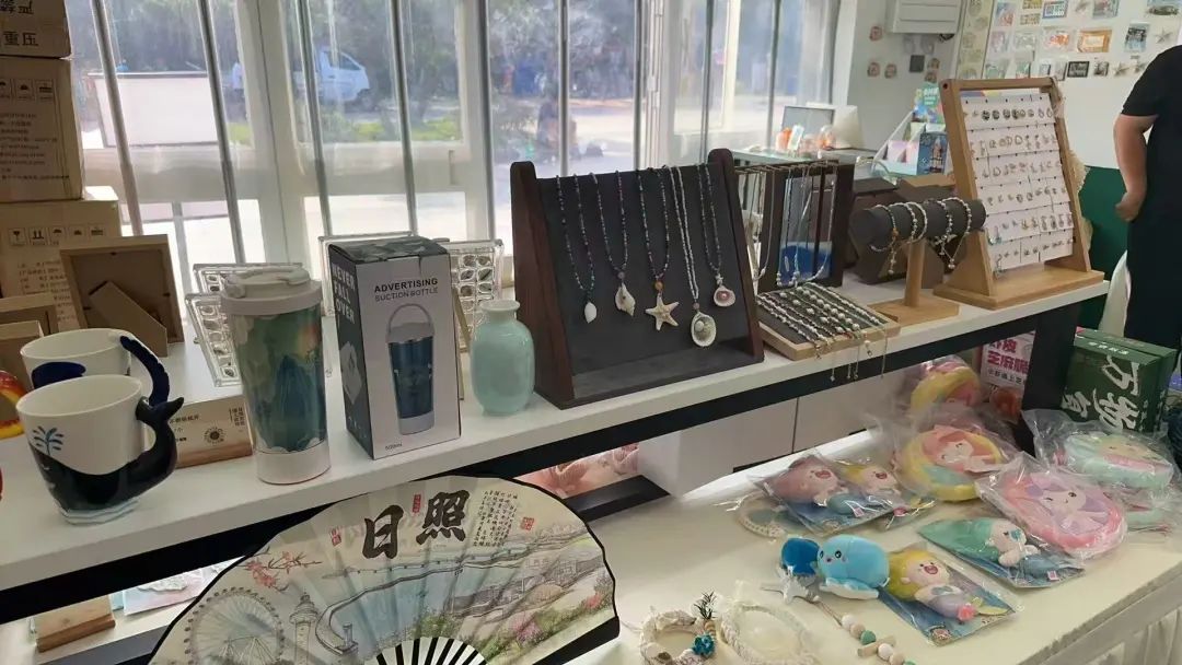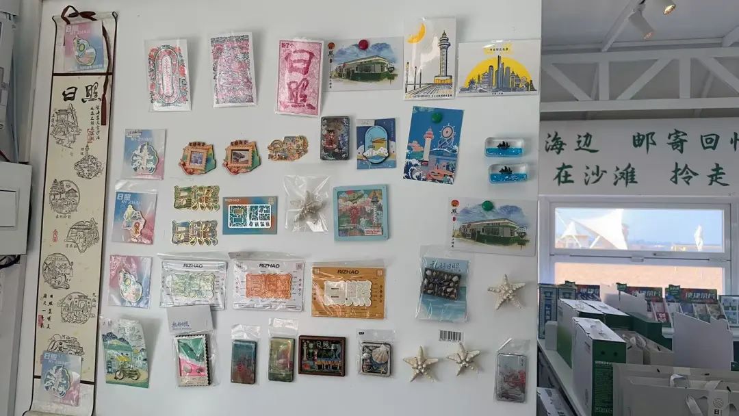 推開(kāi)門(mén),琳瑯滿目的特色城市伴手禮、日照文創(chuàng)產(chǎn)品、明信片、冰箱貼便映入眼簾。