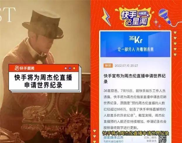 簽下周杰倫,讓快手迎來了新的流量高峰。2020年6月官宣簽約后的首場直播首秀,同時在線人數(shù)達(dá)610萬,觀看總?cè)舜纹?800萬,直播間互動總量3.8億,快手熱度6121萬。2022年7月,周杰倫再次刷新快手直播記錄,43分鐘的直播,累計觀看人數(shù)超1.1億,最高實時在線觀看人數(shù)超654萬,直播間互動量超4.5億,快手官方甚至激動地表示要為周杰倫申請吉尼斯世界紀(jì)錄。