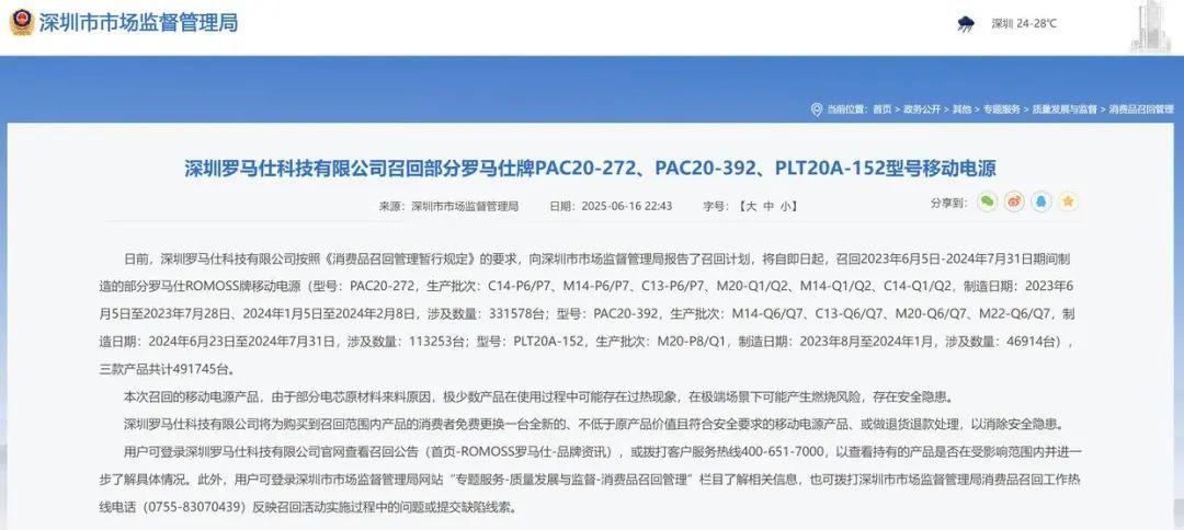 然而,低價(jià)策略也為羅馬仕埋下了隱患。據(jù)可靠消息,為壓縮成本,羅馬仕長(zhǎng)期使用低價(jià)電芯,品控也缺乏嚴(yán)格規(guī)范。2025年6月,因電芯原材料問(wèn)題,羅馬仕不得不召回49萬(wàn)臺(tái)充電寶,3C認(rèn)證被大批撤銷,工廠全面停工停產(chǎn)。