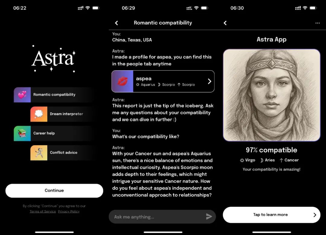 Astra深化了自然聊天的風(fēng)格,例如會主動提問“我看到土星在你的第十宮——這是反思你雄心壯志的好時(shí)機(jī)。你面臨一個(gè)重大決定嗎?”它能靈活運(yùn)用過境、上升星座等占星理論,特色功能有解夢、伴侶星盤測試。