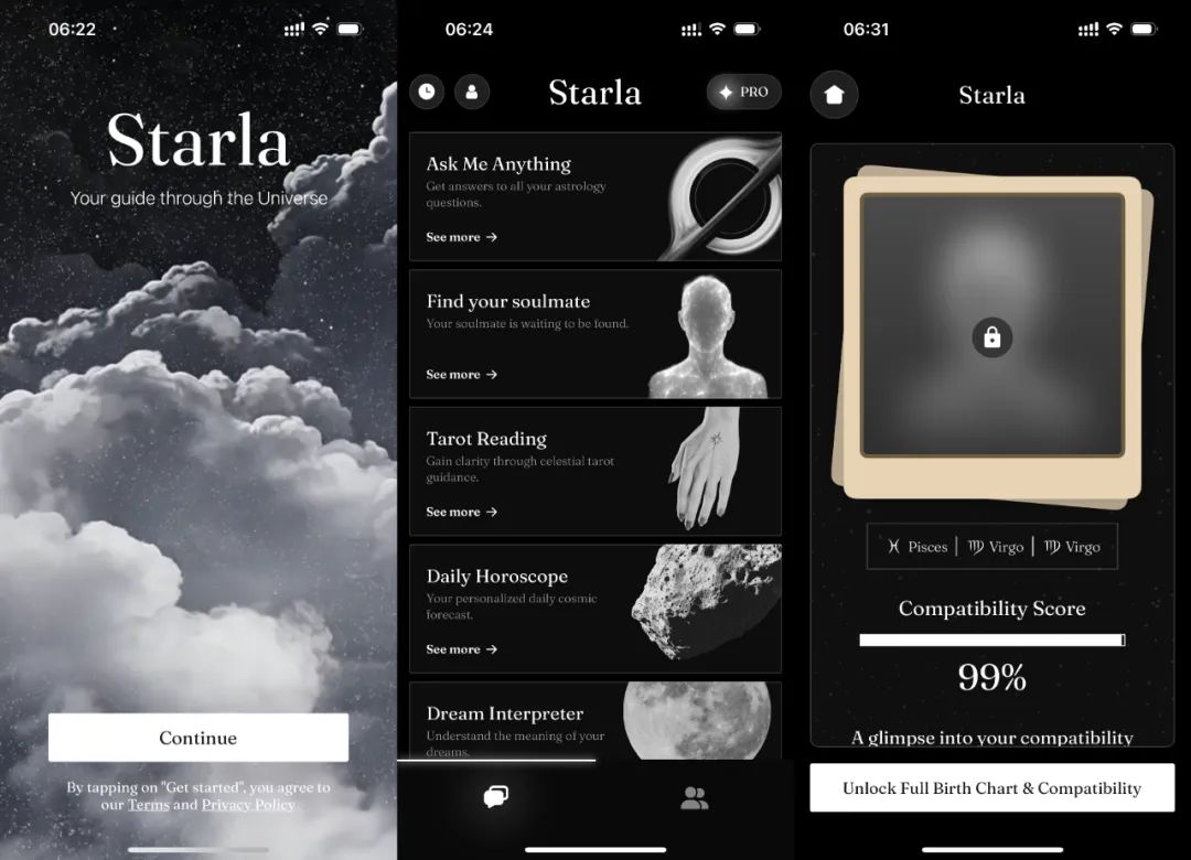 Starla/Astra非常聰明,它們并不“賣星座”,而是將占星術(shù)包裝成一種“心靈游戲”,帶點(diǎn)神秘、帶點(diǎn)曖昧,還能當(dāng)做內(nèi)容曬出去。配合治愈語音、溫柔話術(shù)和精美的UI畫面,這類產(chǎn)品以極低的技術(shù)門檻,構(gòu)建出高感知價(jià)值+高復(fù)購概率的產(chǎn)品模型。